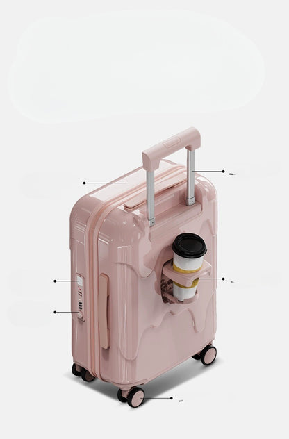 Limited Edition Crème Collection, where luxury meets functionality in a one-of-a-kind drip design. This features two-sided organization compartments with a wet pouch to keep your belongings clean and tidy, along with a built-in cup holder and phone charger port for ultimate convenience. Crafted to be both durable and lightweight, it’s perfect for frequent travelers who value style without compromising performance. Equipped with TSA-approved locks and 360-degree smooth wheels, the Crème Collection ensures secure and effortless travel while turning heads with its bold, elegant design.