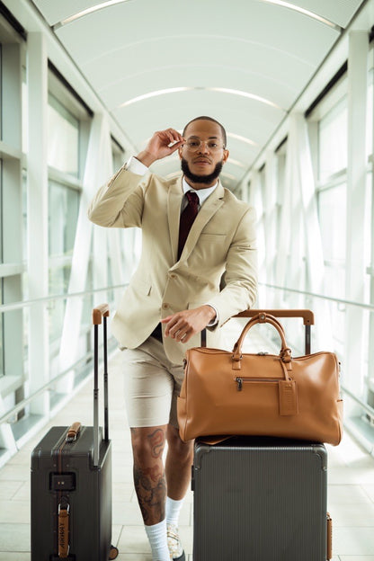 The Getaway Duffle Bag is the ultimate travel companion, crafted from durable, easy-to-clean vegan leather with the perfect dimensions to fit as a free personal item under any airplane seat. Designed for both style and function, this bag features a trolley pass-through for hands-free travel, an anti-theft pocket to secure essentials like your passport and phone, and a padded laptop sleeve that fits devices up to 15 inches. With a wide mouth opening for easy packing and multiple interior compartments to keep everything organized, it ensures stress-free travel. Plus, a discreet hole for your charger cord lets you stay connected on the go. Whether you’re headed for a weekend getaway or a daily commute, the Getaway Duffle is designed to make travel smoother and more stylish.